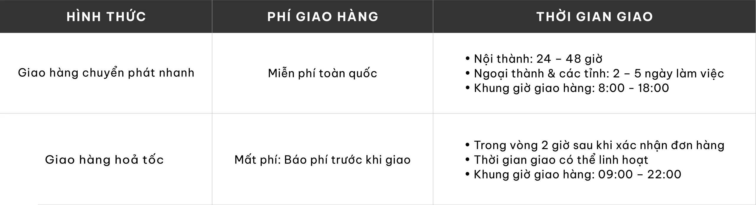 Thời gian giao hàng phụ thuộc vào lộ trình của đơn vị vận chuyển. RF chưa hỗ trợ chọn khung giờ cố định, tuy nhiên shipper sẽ liên hệ trước khi giao. RF có hỗ trợ giao hỏa tốc nội thành Hà Nội & TP.HCM (phí ship khách hàng tự thanh toán).