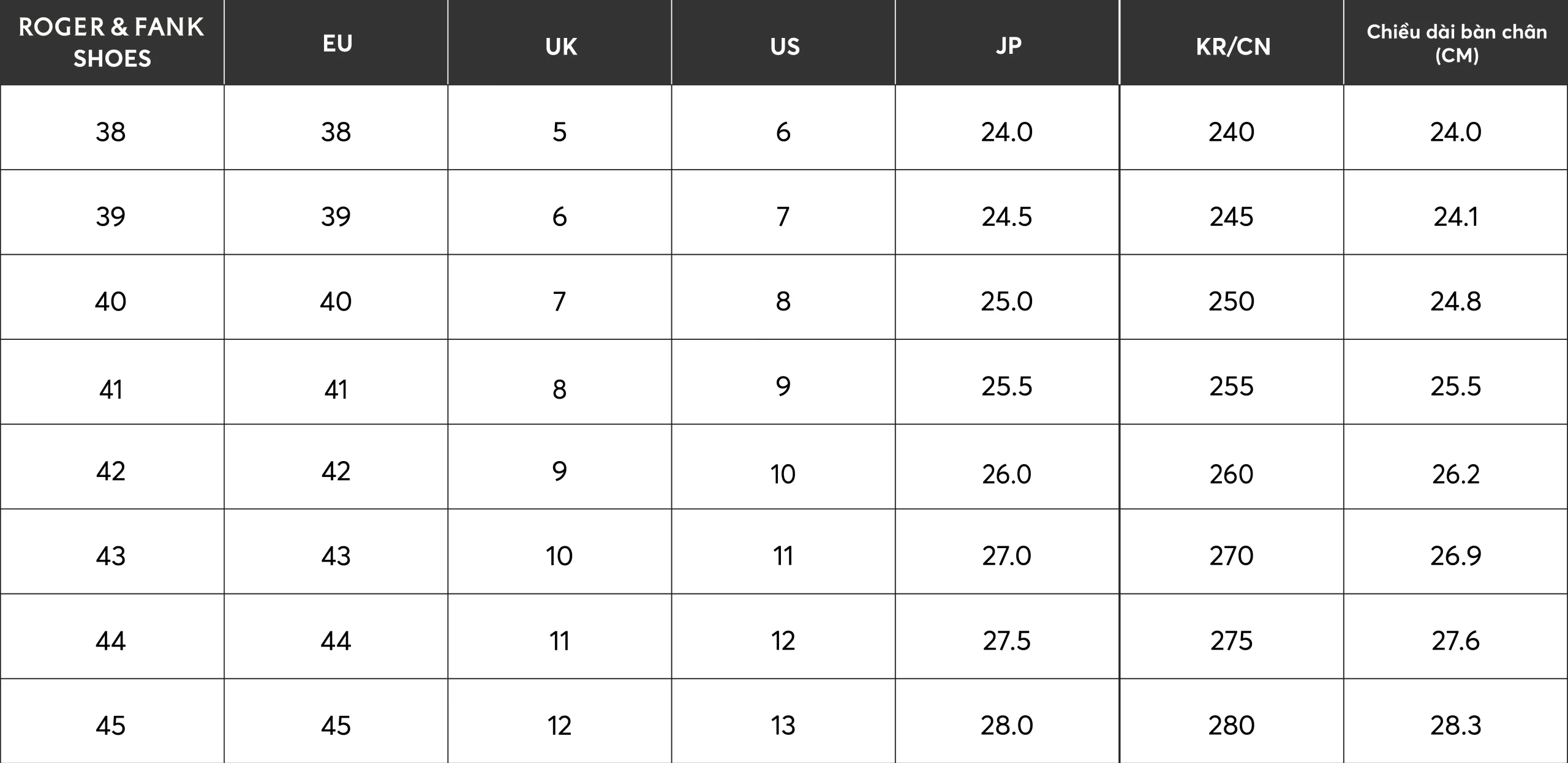 ROGER & FANK sử dụng hệ size Châu Âu (EU) cho tất cả các dòng giàyl. Để chọn được kích thước phù hợp nhất, vui lòng làm theo hướng dẫn dưới đây.
