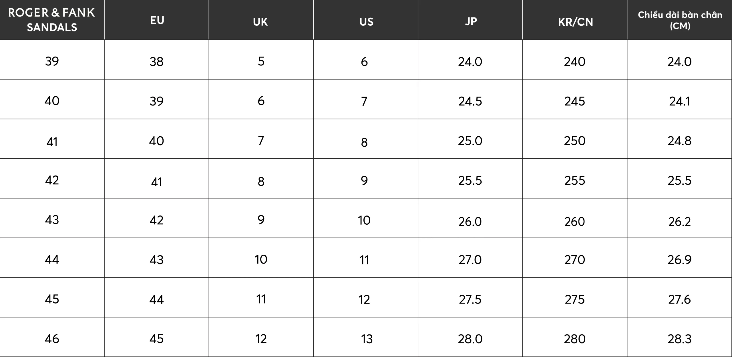 ROGER & FANK sử dụng hệ size Châu Âu (EU) cho toàn bộ các dòng sandal/dép. Form sandal có độ linh hoạt cao hơn giày kín. Để chọn được kích thước phù hợp nhất, vui lòng làm theo hướng dẫn dưới đây.