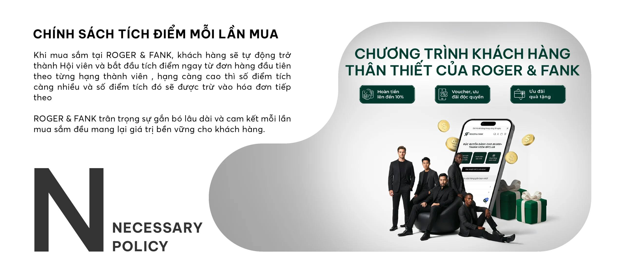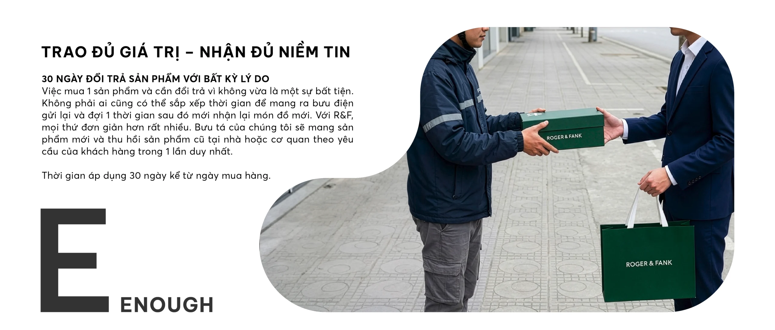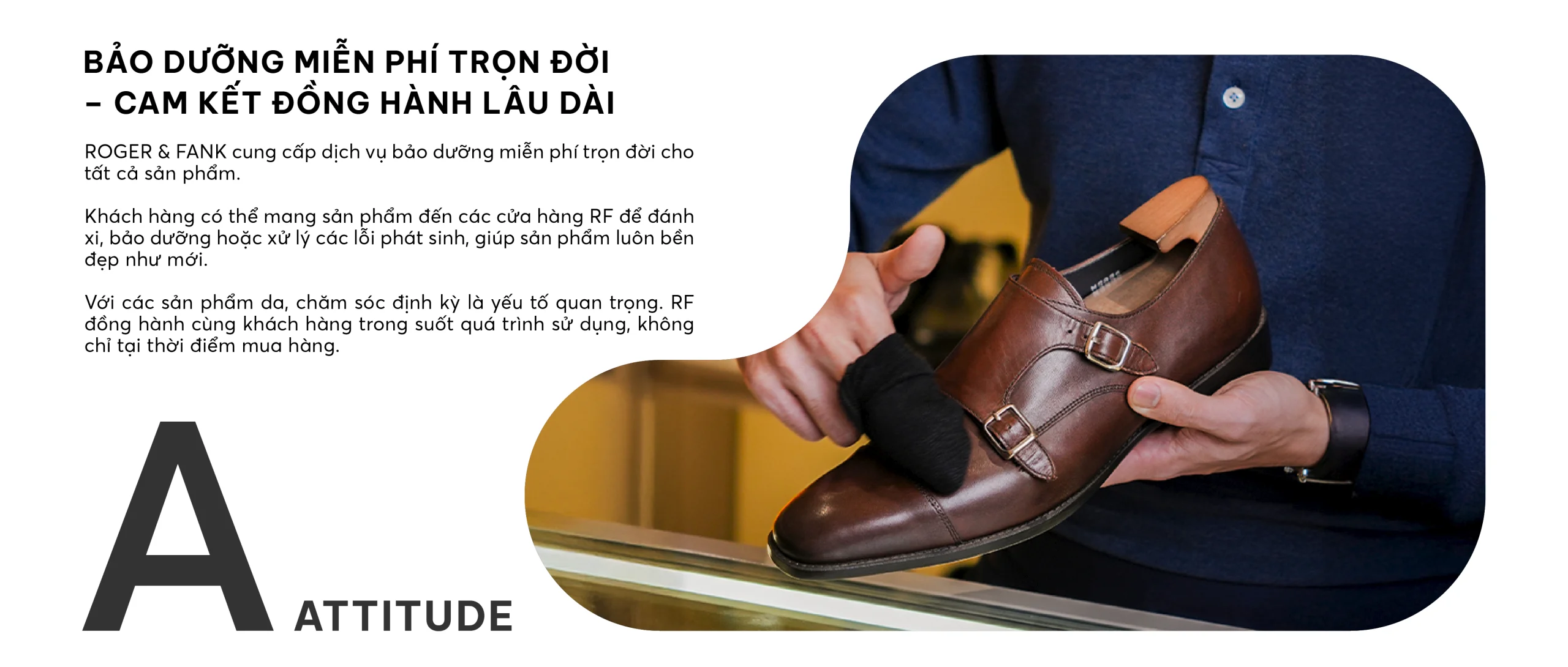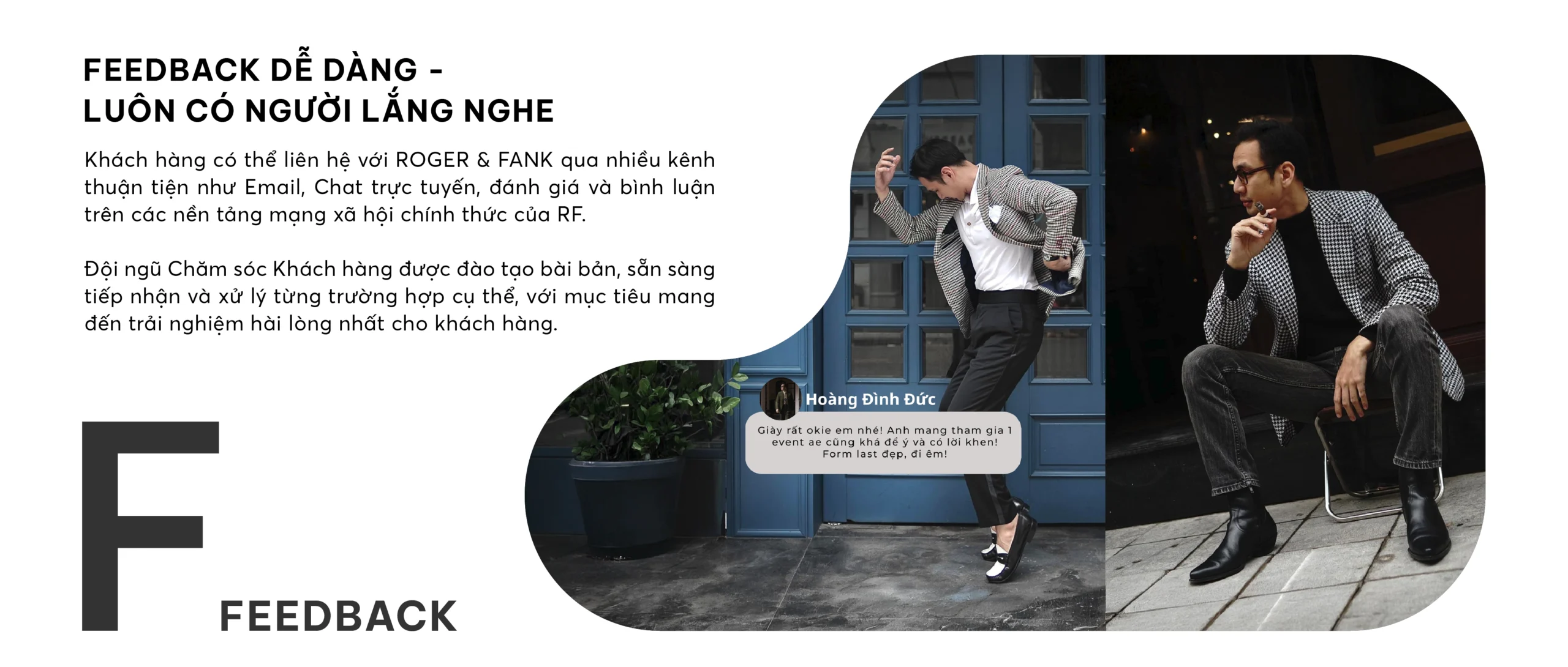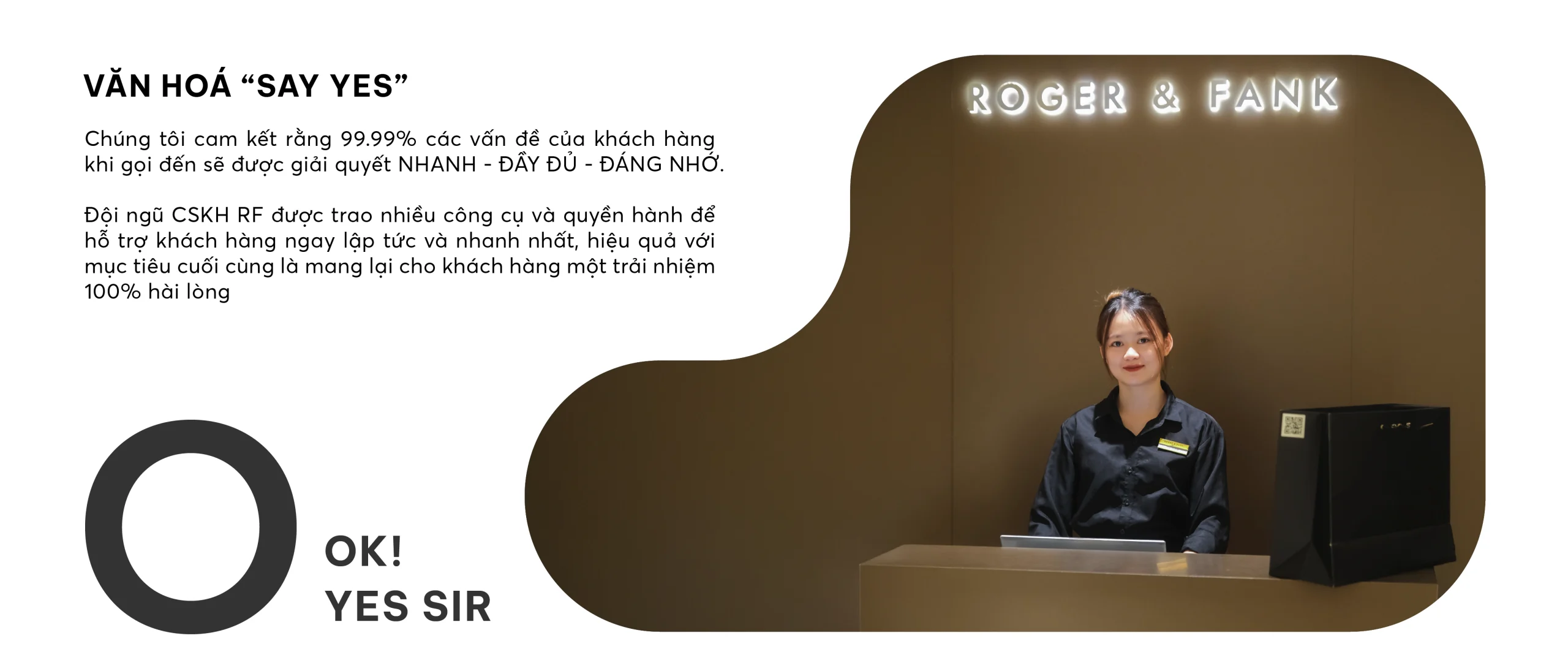 Sự hài lòng của khách hàng là ưu tiên hàng đầu tại ROGER & FANK. Mỗi lựa chọn bạn đưa ra đều xứng đáng được tôn trọng. RF không chỉ bán sản phẩm, chúng tôi cam kết và chịu trách nhiệm cho toàn bộ trải nghiệm. 9 cam kết dưới đây là chuẩn mực trải nghiệm mà RF theo đuổi.